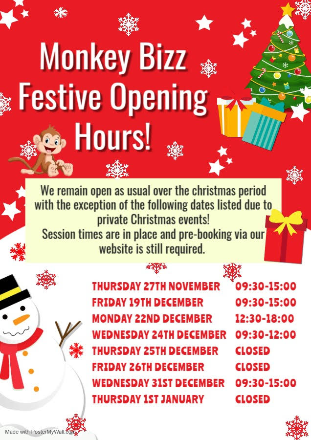 We look forward to welcoming you to Monkey Bizz where our 2 ½ hour sessions run 7 days a week.